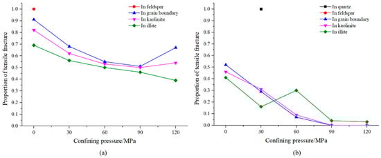 The proportion of tensile fractures within cracks passing through various minerals under different confining pressure conditions for tensile loading (a) and shear loading (b).