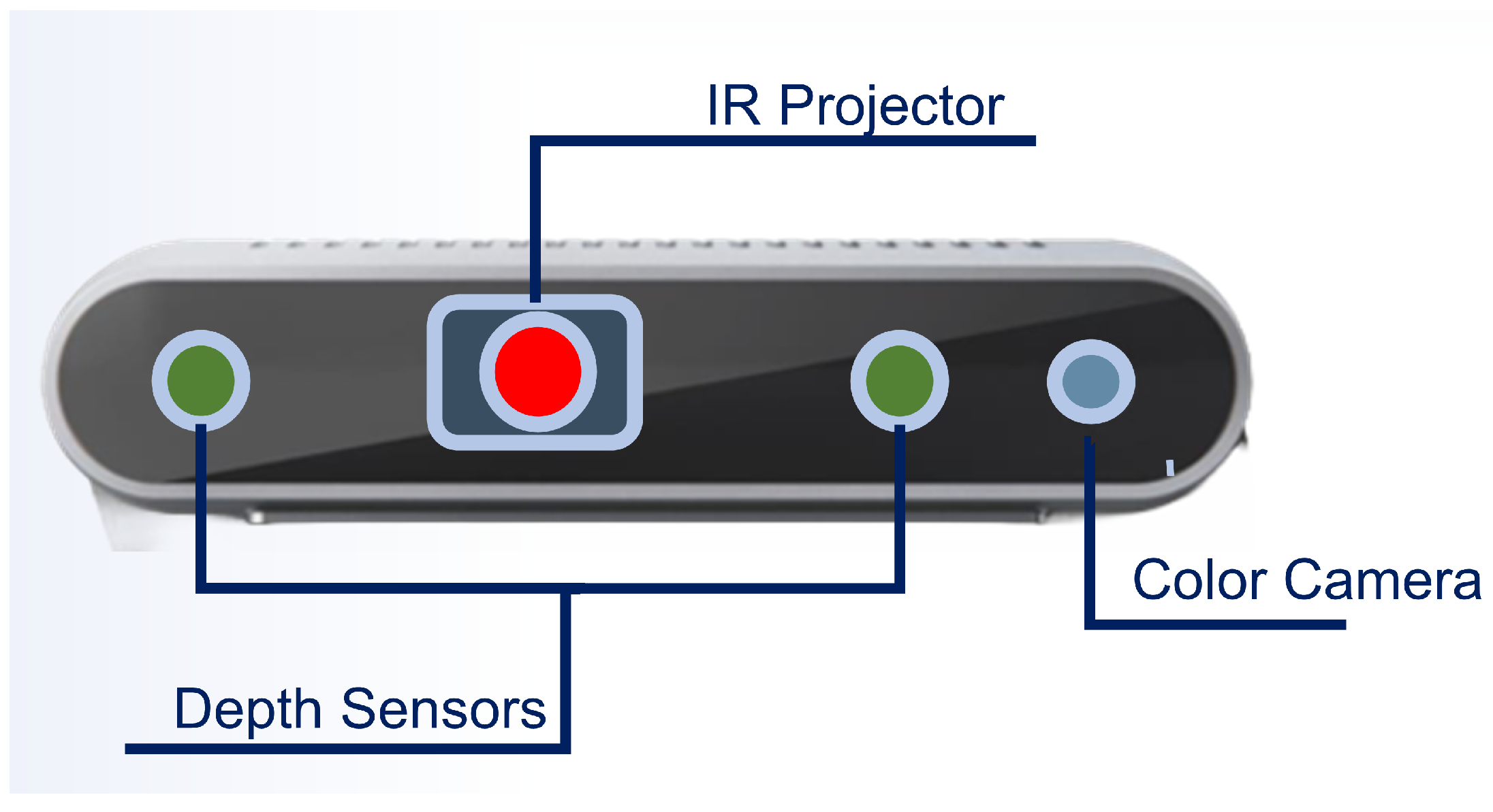 The camera is configured and installed upside down for operational requirements, involving a 180-degree rotation of captured frames in subsequent data processing stages. The post-process stage begins with a Python script developed using the pyrealsense2 library (Intel RealSense SDK 2.0, Intel Corporation, Santa Clara, CA, USA; accessed on 10 July 2024). script developed to handle data recorded in a compressed .bag file format. This script extracts synchronized RGB and depth images, aligns them spatially and temporally, and saves these images as structured MATLAB data (MATLAB R2024a, MathWorks, Natick, MA, USA). (.mat files) for further processing. In our setup, the RealSense D435i camera (in Figure 3) recorded synchronized RGB (640 × 480) and depth (640 × 480) frames at 15 fps, ensuring uniform temporal sampling for all the following analyses.
