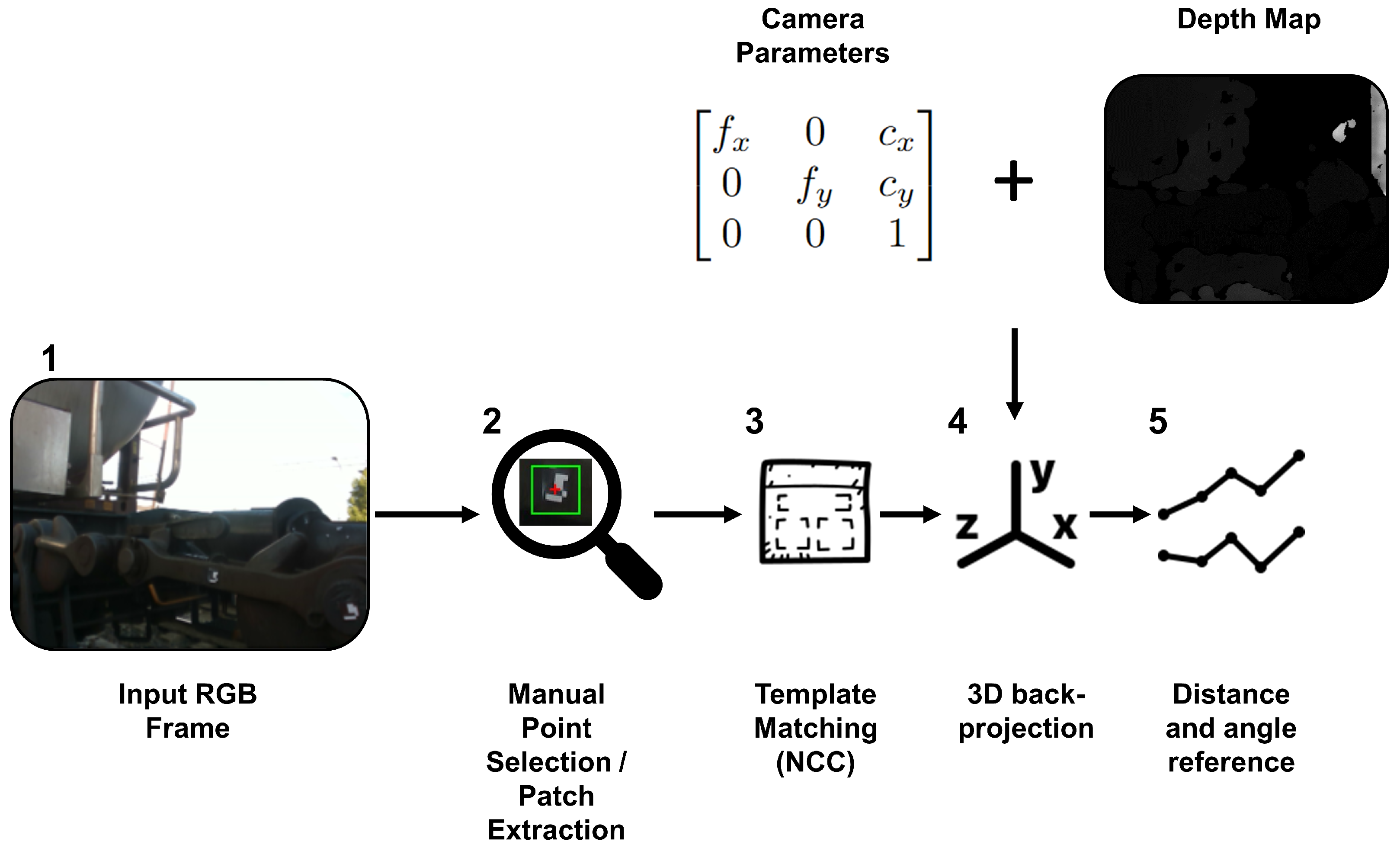 In recent years, computer vision has therefore emerged as one of the main technologies driving automation in the railway sector. Early approaches, such as that by [25], demonstrated the feasibility of deep learning use for rail track monitoring, paving the way for the new AI-based generation. Since then, several solutions have used Convolutional Neural Networks (CNNs) and multimodal sensing to improve detection accuracy and environmental robustness. In [26,27], CNN-based systems for rail surface and defect detection have been developed, achieving high precision under controlled conditions. In [27], a model has been proposed to reduce computational complexity, enabling a near real-time inference on embedded GPUs. In [28], it is possible to find a comprehnsive study on the use of CNNs for track maintenance, highlighting the need for a reliable generalization under variable lighting conditions. More recent developments have focused on enhancing computational efficiency and enabling real-time onboard operation. The method proposed in [29] is a lightweight convolutional network for missing bolt detection, optimized for deployment on resource-limited embedded devices. The study by [30] presents RH-Net, a CNN–transformer hybrid architecture that achieved high accuracy and real-time performance for obstacle detection. The study by [31] improved generalization through the use of multiple CNNs across multiple track conditions, while [32] proposed an FPGA-based AI solution for fault detection that balances energy efficiency and computational speed. Hybrid vision–sensor systems have also been explored: The authors of [33] developed a wayside AI-assisted vision system that integrates optical inspection with vibration sensing. The authors of [34] implemented an unsupervised anomaly detection framework based on autoencoders, identifying visual irregularities without prior labeling. Further lightweight approaches, such as that by [35], further demonstrate the trend toward embedded, real-time, and efficient visual inspection systems. Despite these advances, many limitations remain: many current systems depend on high-end computing or offline data processing, which affects their scalability for deployment. Moreover variations in illumination, vibration, and occlusion remain key challenges affecting robustness. While significant progress has been achieved, there is still a clear need for cost-effective, onboard, and real-time vision systems capable of maintaining reliable performance under operating conditions. Based on these considerations, this study proposes a vision-based monitoring framework designed to overcome limitations such as dependence on high-end hardware, limited adaptability, and a lack of 3D motion estimation. This work introduces a practical computer vision approach designed for onboard implementation.