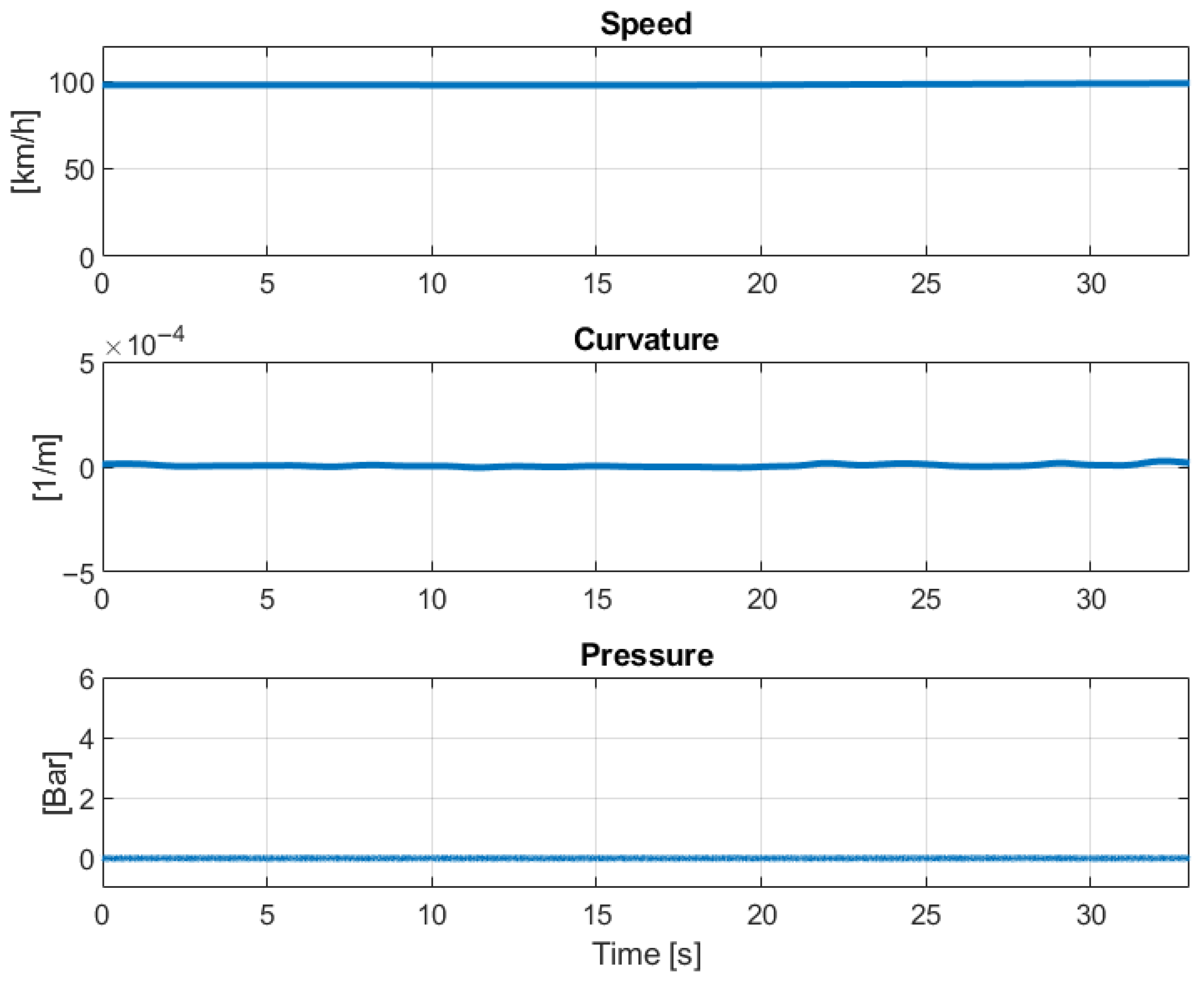Figure 8. Trainset speed, line curvature, and brake cylinder pressure in the section considered during the acquisition phase.