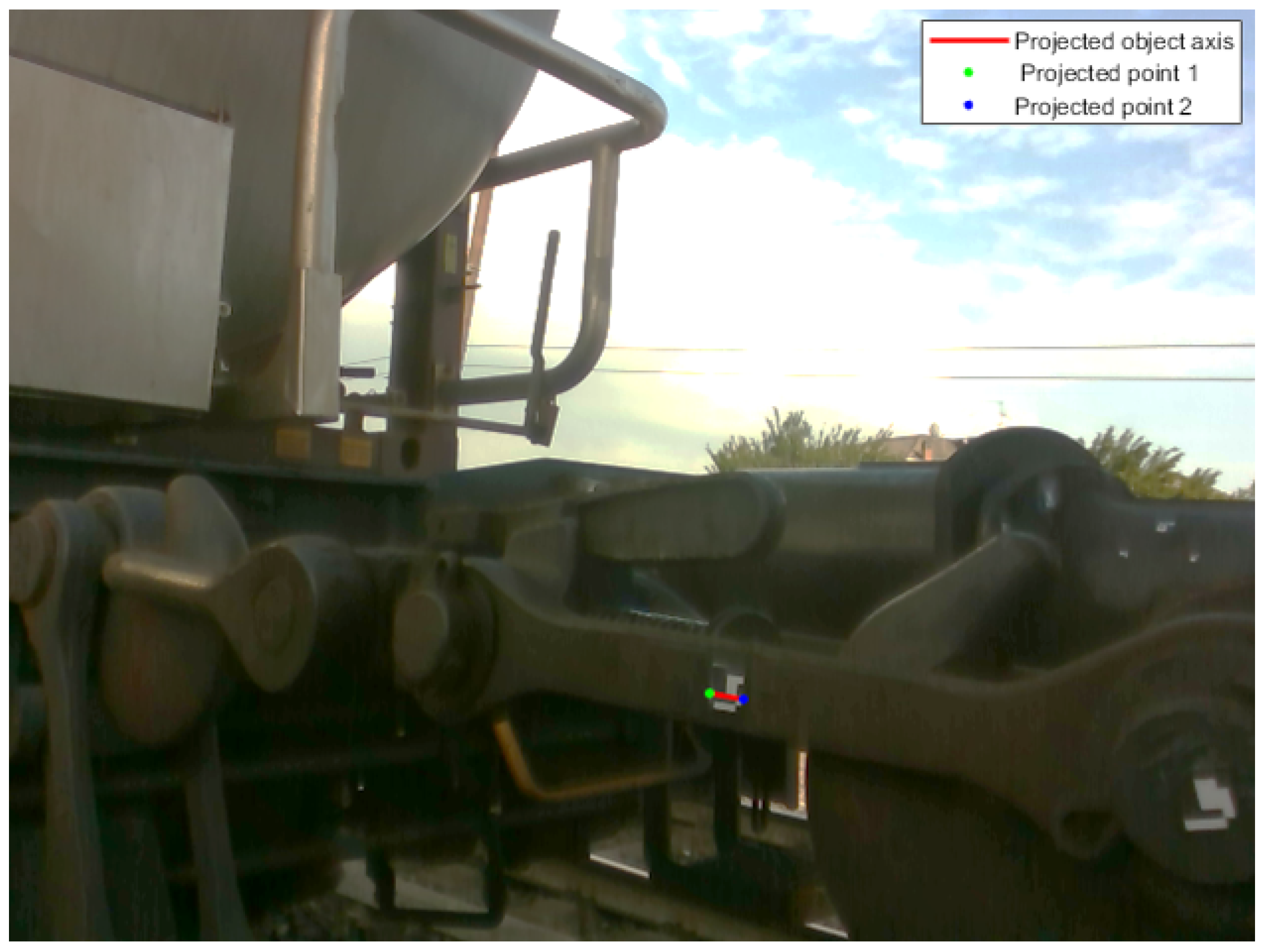 The first experimental scenario deals with the monitoring of rotation behavior of the hook, that is, the rigid mechanical component coupling two railway carriages. Figure 9 shows the projection of the measured 3D axis and tracked points onto the camera image.