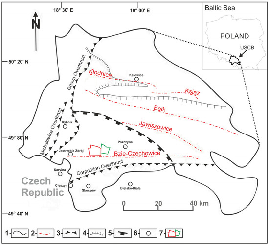 Figure 1. Map of the Upper Silesian Coal Basin (modified after [12]): (1) boundaries of the Polish part of the USCB; (2) major fault zones; (3) overthrusts; (4) extent of the continuous Miocene cover; (5) extent of the secondary methane zone (ticks inward); (6) major cities; (7) Pniówek and Pawłowice mine boundary.