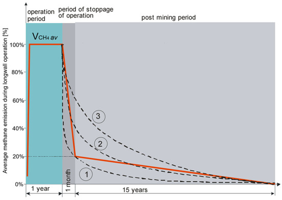 The model encompasses the entire emission lifecycle: the average 1-year operational period, a 1–3-month closure phase, and a prolonged 15-year post-mining emission period [18]. Initially, high-volume degassing of undermined and overmined seams occurs during active mining and equipment dismantling. This is followed by a long tail of slower methane desorption from those seams.