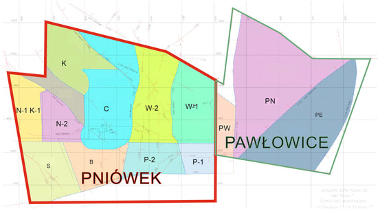 Figure 3. The ‘Pniówek’ and ‘Pawłowice’ mining areas under methane drainage potential evaluation, together with the deposit parts. This extent is shown relative to the entire USCB in Figure 1 (Legend 7).