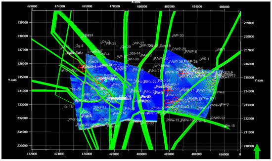 Figure 4. Location of the main (high-resolution) model against the mine extent, showing available spatial digital data (faults and contour lines of individual coal-seam floors) and the locations of boreholes with available geophysical well-logging curves (red symbols).