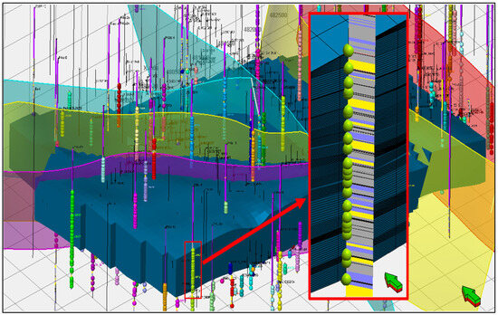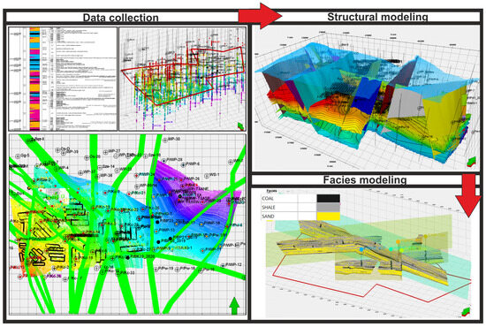 The data set included locations and trajectories of surface and underground boreholes, stratigraphic and lithological logs, geophysical well logs in six boreholes (Figure 4), traces of tectonic dislocations/faults, digital seam-floor and -thickness maps, and supporting laboratory descriptors. The workflow (Figure 5) comprised compilation and QC of inputs; inter-well correlation with correction of inconsistencies (level of lithological detail and occasional seam mis-ties) to a harmonized stratigraphic scheme; construction of the structural model (horizons, faults, and zoning) including capturing the geometry of longwalls within all coal seams under exploitation; and facies modeling to reconstruct the lateral–vertical distribution of sandstone/coal/shale on the 50 × 50 m and 10 × 10 m grids. The resulting structural grids, facies probability volumes, and local lithology cubes were exported and used to define candidate drainage horizons, azimuths relative to anisotropy, and borehole trajectories.