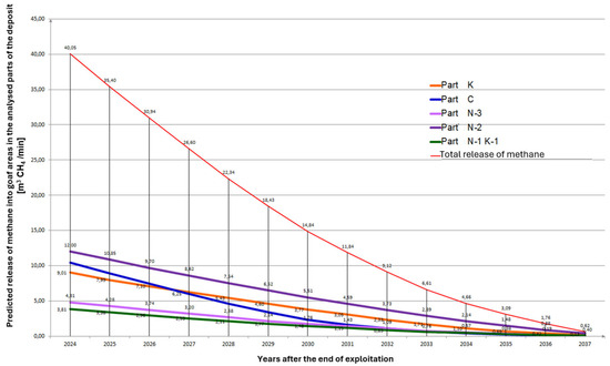 Figure 7. Summarized projected release of methane into goafs in parts “K”, “C”, “N-3”, “N-2”, and “N-1 K-1” of the “Pniówek” mining area.
