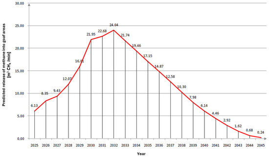 Table 3 presents the calculated predictions of methane release into isolated goaf areas after longwall extraction in the “W-1”, “W-2”, “P-1”, “P-2”, “PW”, and “PN” parts from 2025 to 2045. Figure 8 shows the total release of methane into isolated longwall goaf areas selected in parts “W-1”, “W-2”, “P-1”, “P-2”, “PW”, and “PN” in 2025–2045.