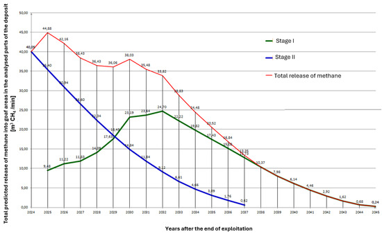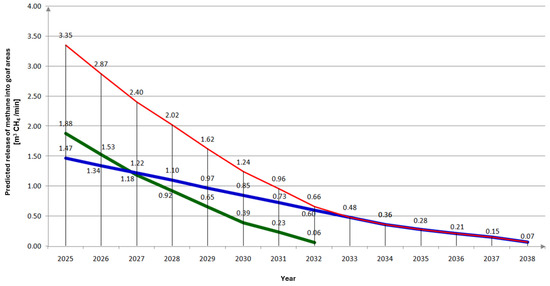Figure 10. Total forecasted release of methane into goaf areas of post-mining parts (red) calculated under Stages I (blue) and II (green).