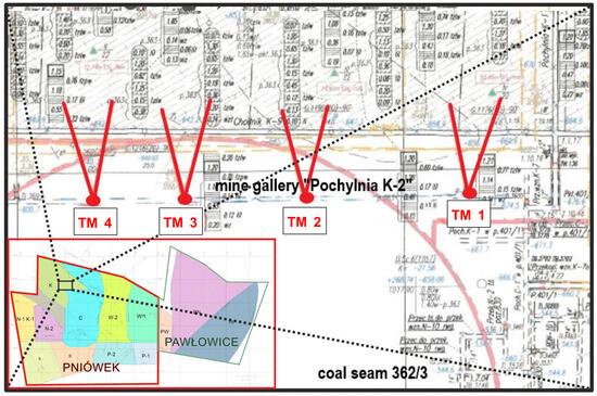 Three of the four designed boreholes were drilled from the K-2 ramp (seam 362/1) (Figure 16); the TM-3 station remains scheduled for drilling. The stations were positioned along the run of longwall K-5 in seam 361, which was exhausted in 2011. Using a spatial lithotype model—integrating lithological well logs and mine workings maps—the area was evaluated for the positions of exhausted seams and for the likely occurrence of sandstone and siltstone intervals favorable for drilling.