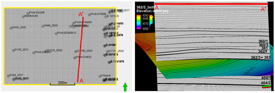 Within the planned methane drainage zone (the defined K part area), a local high-resolution structural model on a 10 × 10 m horizontal grid was constructed and constrained by underground borehole profiles. The model refined seam geometry in the target area, enabling a higher level of detail in the spatial lithology model required for precise drainage borehole trajectory design. Vertical relationships between the K-2 ramp (seam 362/1) and the target seams (360/1, 361, 362/3+363, and 360/1) were determined with precision, which allowed us to define expected contact intervals within caving zones and to delineate the trajectory of the boreholes. Intervening zones between seams were subdivided into additional layers so that the vertical resolution captured lithological variability in the well profiles, with particular emphasis on sandstones as preferred drilling targets. A view of the structural model with the imposed layering is shown in cross-section A–A′ traversing the study area (Figure 13).