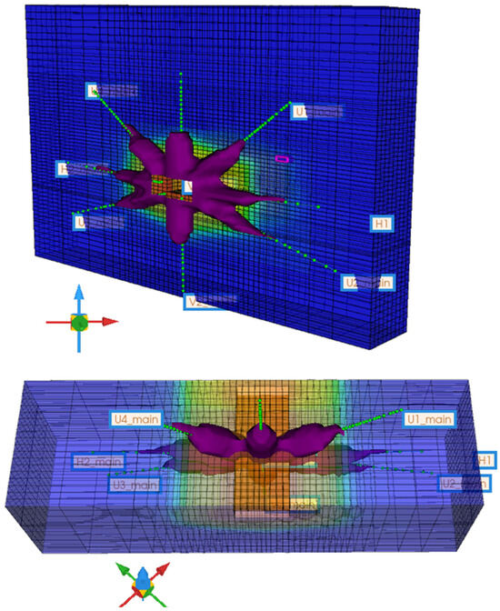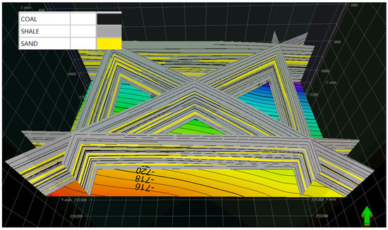 Within the precisely reconstructed coal-seam geometry, zones dominated by sandstone facies (potentially favorable for transmission and efficient gas capture) and zones with elevated siltstone/mudstone content (local flow barriers) were identified (Figure 14). Unlike the structural model, which defines the geometry of seams and faults, the lithological (facies) model represents spatial lithological variability, allowing for assessment of intervals and contacts that promote methane escape to mine workings versus those that favor its retention and accumulation in goafs, as well as estimation of the risk of flow discontinuities arising from local facies changes.