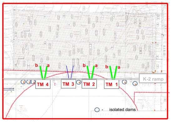 Figure 16. Location of the designed methane drainage boreholes and isolation dams in relation to the K-2 ramp (362/1). Boreholes marked in green have been drilled; the borehole marked in blue is planned for drilling.