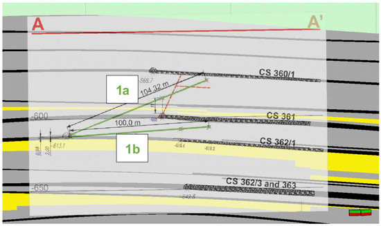 The target seams selected were 360/1, 361, 362/1, 362/3, and 363. In defining the technical parameters of the methane boreholes, we accounted for the extraction height of longwall K-5 in seam 361 and the vertical distances to adjacent exhausted seams. An illustrative axial cross-section of methane boreholes from station TM-1a/b against the lithological distribution along section A–A′ is provided (Figure 17).