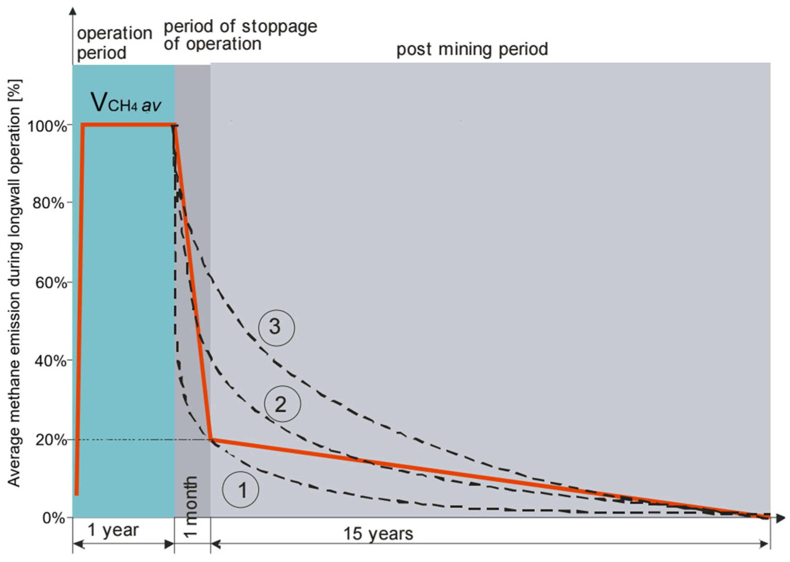 - Curve 1 reflects a scenario where methane from the mined seam itself predominates, with minimal contribution from the surrounding strata. If no gassy seams are present in the destressed zone, inflow can be nearly zero.