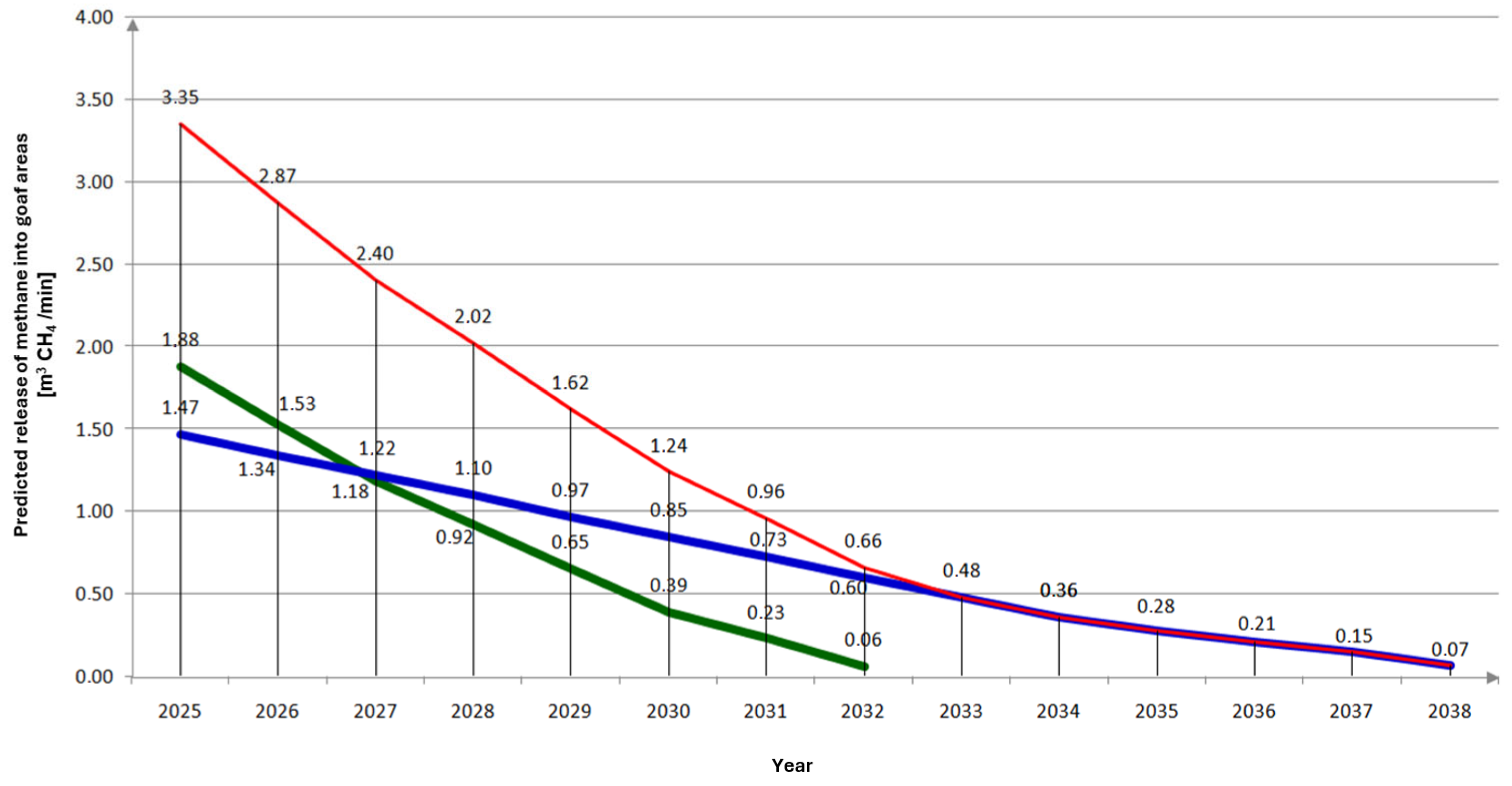 - Curves 2 and 3 indicate a significant and sustained methane influx from the destressed undermined and overmined seams, which becomes the primary long-term source. Underground field tests and geological analysis confirm this high variability in emission patterns.