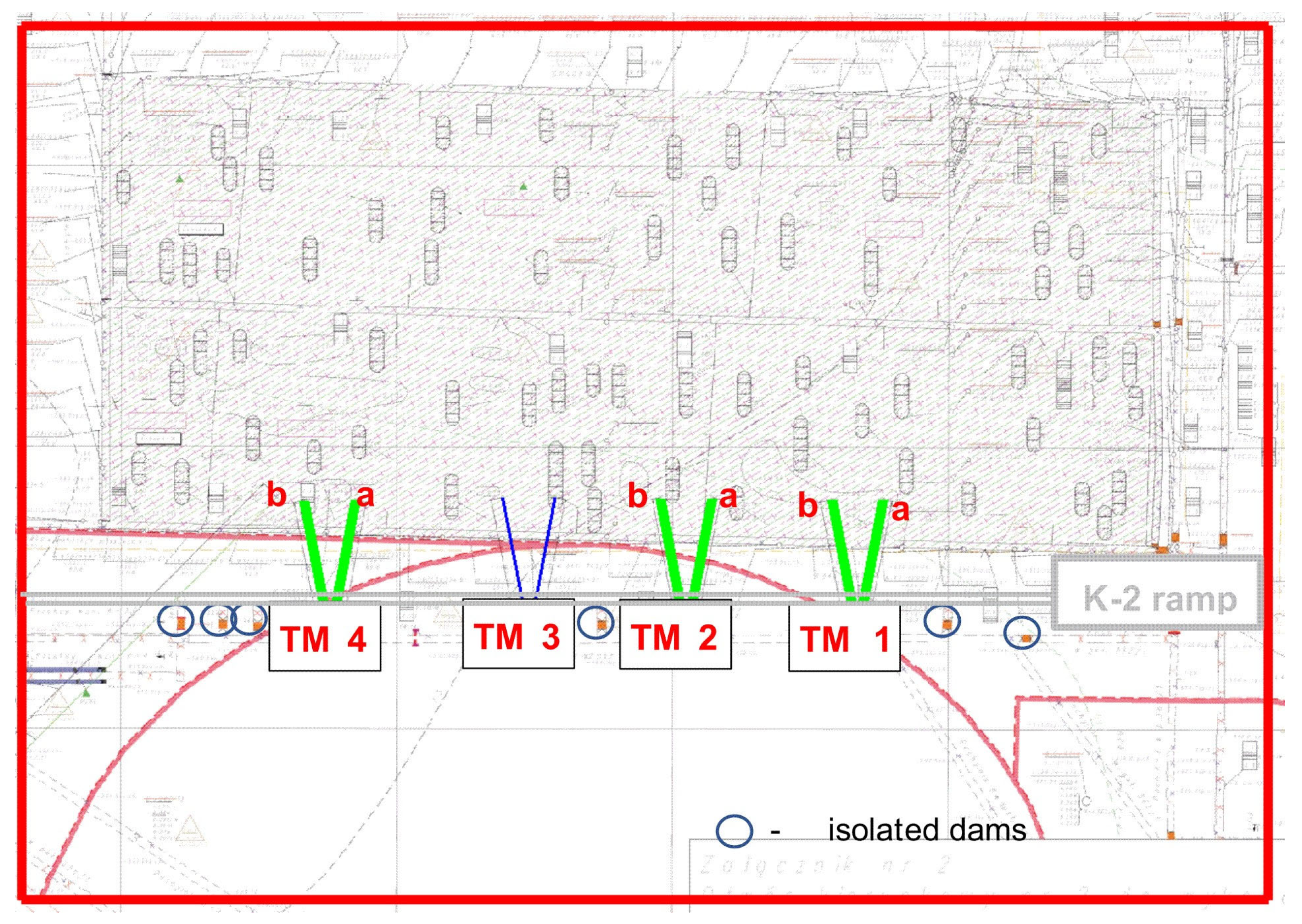 - Tajduś, K. Określenie Wartości Parametrów Odkształcenia Górotworu Uwarstwionego w Rejonie Wpływów Eksploatacji Górniczej. Ph.D. Thesis, AGH University of Science and Technology, Kraków, Poland, 2008. [Google Scholar]