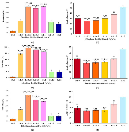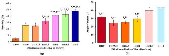 Effect of the amount of olive oil on the volatility of aromatic constituents and flowing property of (a,b) CO-, (c,d) LO-, (e,f) RO-, and (g,h) PO-containing adsorbents, respectively. Notes: (a,c,e,g) Each sample (500 mg) was stored at 40 ± 2 °C for 12 h in an open state. (a–h) Data represent mean ± SD (n = 3). Significant differences compared with 1:0:0 ratio (* p < 0.05), 1:1:0 ratio (** p < 0.05), 1:1:0.25 ratio (# p < 0.05), 1:1:0.5 ratio († p < 0.05), 1:1:1 ratio (†† p < 0.05), 1:1:1.5 ratio (‡ p < 0.05), and 1:1:2 ratio (‡‡ p < 0.05), respectively.