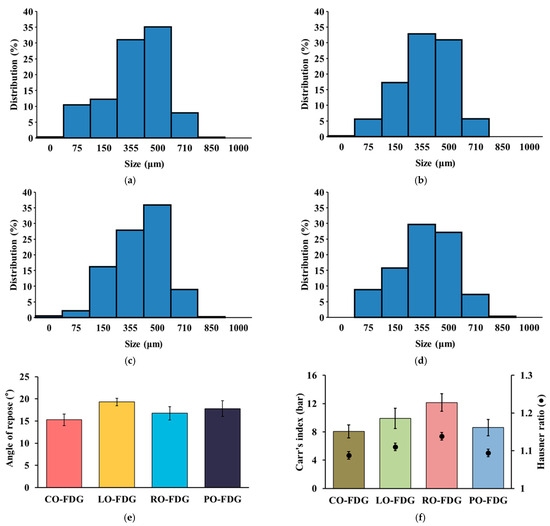 The particle size distribution of the FDGs, determined by the sieving method, is presented in Figure 6. All four FDG formulations exhibited similar size distribution (Figure 6a–d), with median diameters (D50) ranging from 457.5 to 501.8 μm. This distribution closely reflects the particle size characteristics of the major sugar alcohols—mannitol, xylitol, and sorbitol—used as key excipients in the formulations. Flowability assessment based on angle of repose measurements revealed significant improvements across all formulations, with values ranging from 15° to 19°, corresponding to the “excellent” flowability category according to pharmaceutical standards (Figure 6e) [65]. Furthermore, CI values of 8.07–9.92% and HR values of 1.09–1.11 for CO-FDG, LO-FDG, and PO-FDG also indicated “excellent” flowability. RO-FDG, with a CI of 12.15% and an HR of 1.14, demonstrated “good” flowability (Figure 6f) [66]. This improved flowability could be attributed to the combined effects of mannitol, xylitol, and sorbitol, which are known to provide good compressibility and flow characteristics when used as fillers. Collectively, we concluded that all FDG formulations possess sufficient to excellent powder flow characteristics, suitable for subsequent manufacturing processes such as automated filling into four-layer laminated pouches.