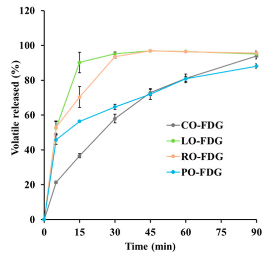 In vitro volatile release profile of artificial saliva-wetted FDG formulations. Note: Data represent mean ± SD (n = 3).