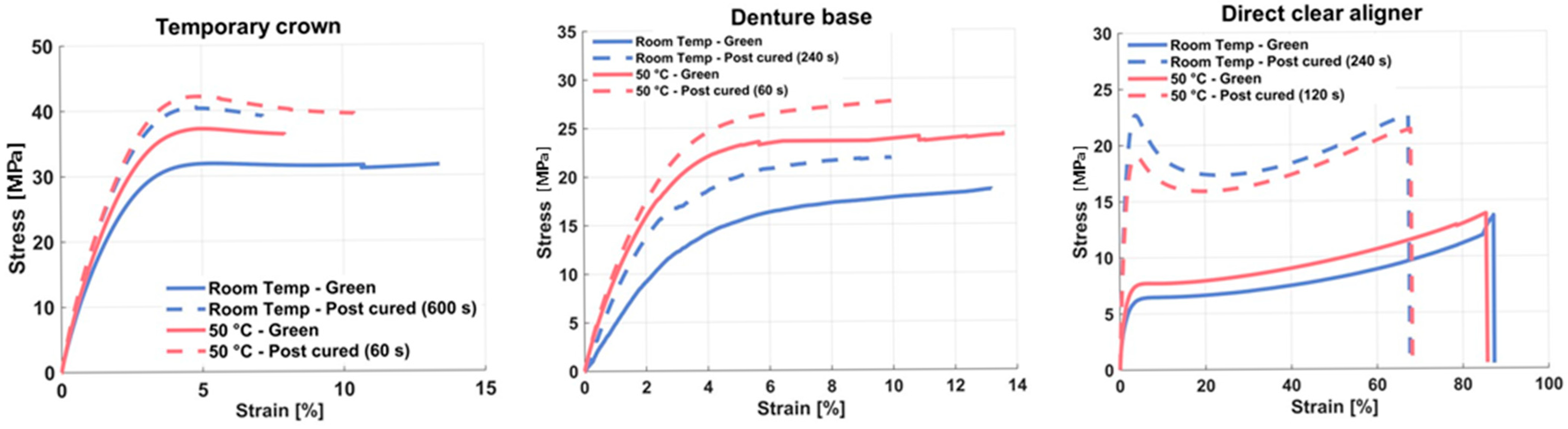 - Sahrir, C.D.; Lin, W.-S.; Wang, C.-S.; Lin, H.-E.; Wang, C.-W.; Lin, W.-C. Effects of 3D-Printers and Manufacturer-Specified Post-Curing Units on the Dimensional Accuracy, Compressive Strength, and Degree of Conversion of Resin for Fixed Dental Prostheses. J. Dent. Sci. 2025, 20, 1699–1708. [Google Scholar] [CrossRef]