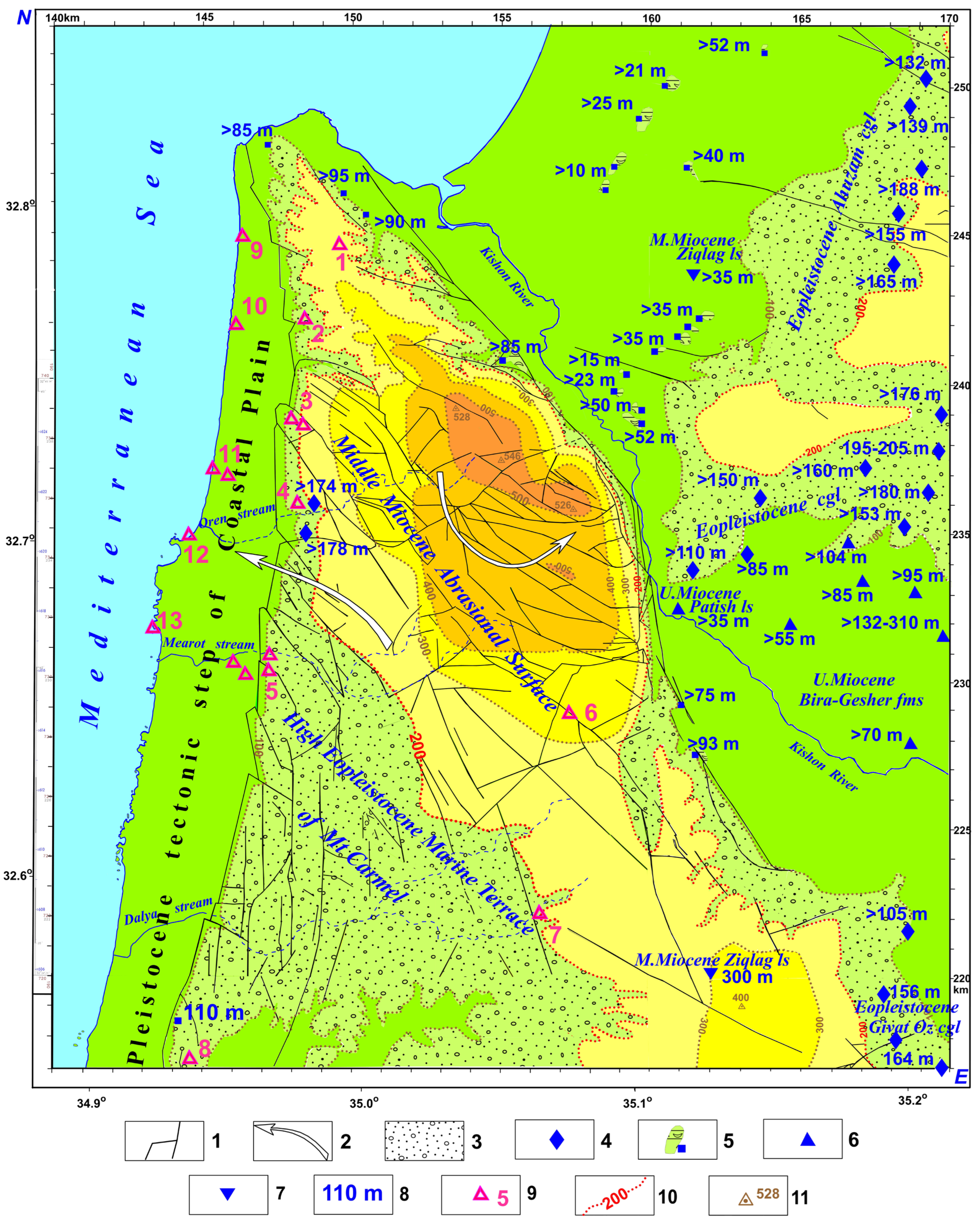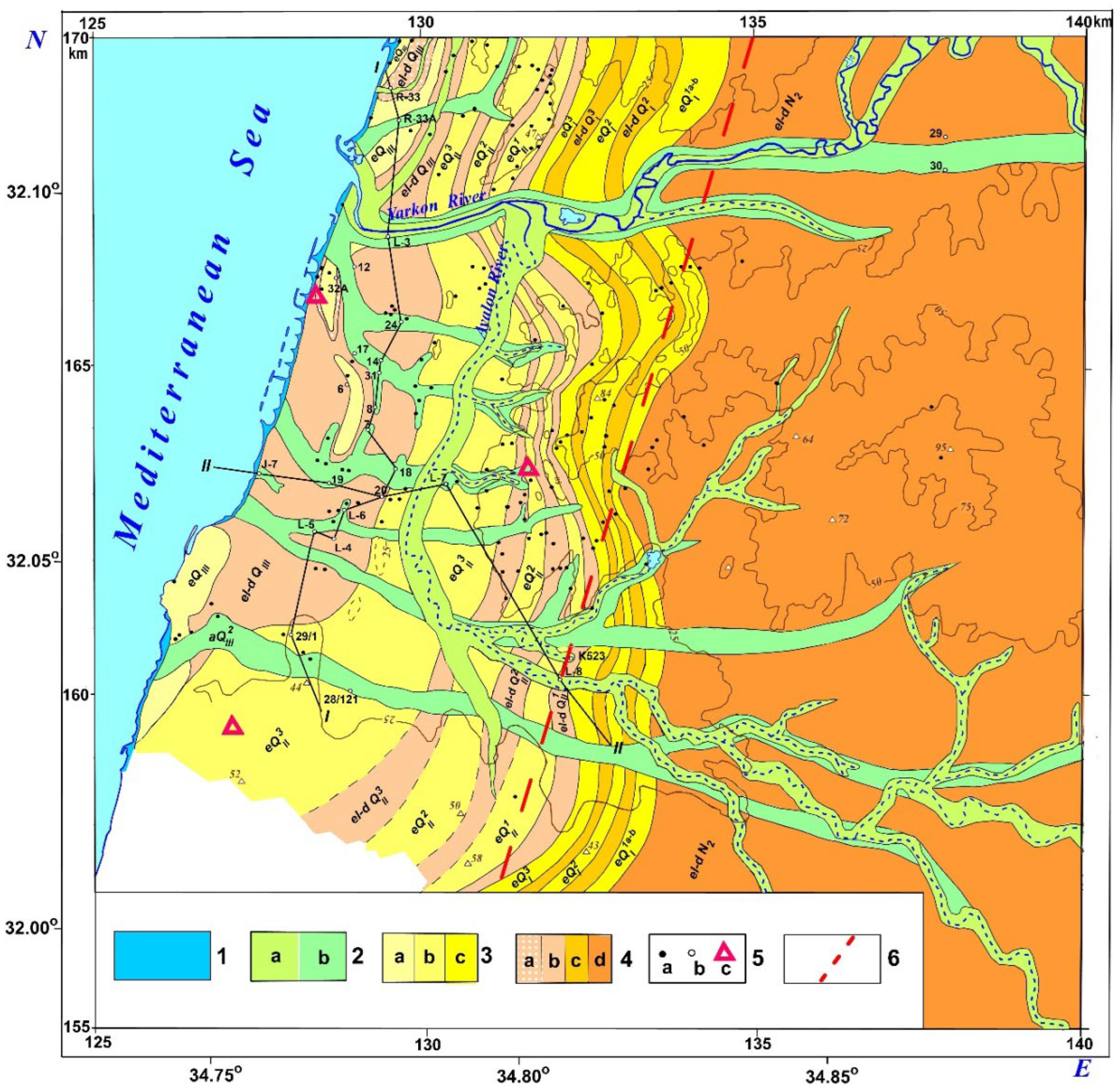 - Sneh, A.; Sass, E.; Bein, A.; Arad, A.; Rosensaft, M. Sheet 5-I, Hadera. Geological Map of Israel, Scale 1:50,000; Geological Survey of Israel: Jerusalem, Israel, 2014.