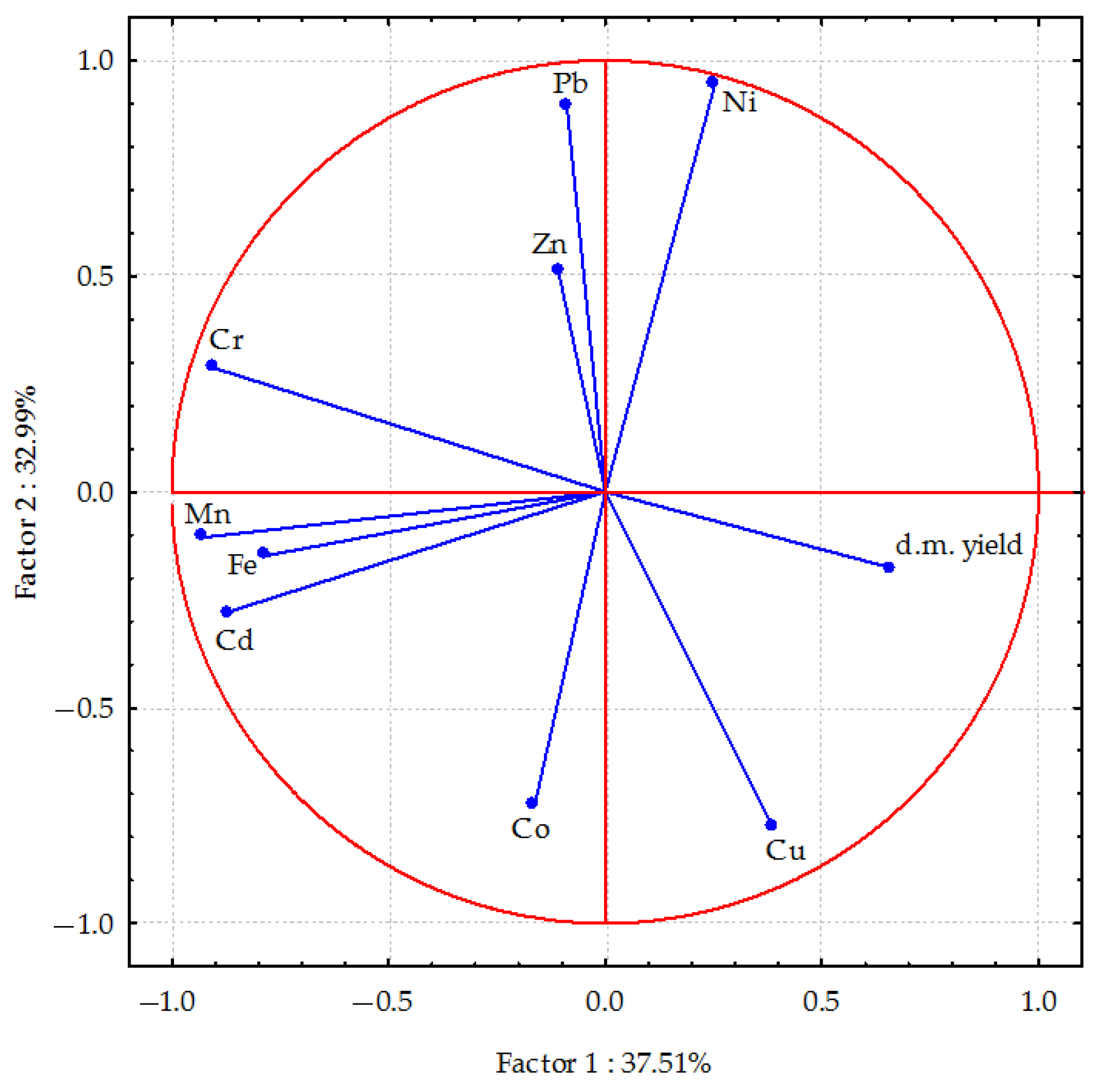 Figure 2 shows the relationships between the trace elements found in oats. Factor 1 explains 37.51% of the total variance in the data, meaning it is the most significant source of variation between the data points. Factor 2 accounts for 32.99% of the variance. The distribution of vectors in Figure 2 indicates a strong positive correlation between nickel and zinc content, as well as a negative correlation between cobalt content and factor 1. Conversely, chromium and lead content in oats were positively correlated, while copper and cobalt content were negatively correlated with factor 2. Longer vectors (e.g., Cu, Cd and Pb) indicate a greater contribution to variability in the data, while shorter vectors (e.g., Zn and Co) indicate a smaller impact. A small angle between vectors indicates a strong correlation. Strong positive correlations were found between elements in plants, particularly cadmium with manganese and iron. Positive correlations were also found between chromium and lead, iron and manganese; between nickel and lead. Partial positive correlations were found between nickel and zinc. The correlations between copper and cobalt were also positive, albeit weaker. Conversely, the copper content in plants was negatively correlated with chromium, lead, nickel and, to a lesser extent, zinc. Similarly, cadmium content in plants was negatively correlated with lead and nickel accumulation, and to a lesser extent, zinc. Dry matter yield of oats was also negatively correlated with manganese, chromium, cadmium and iron.