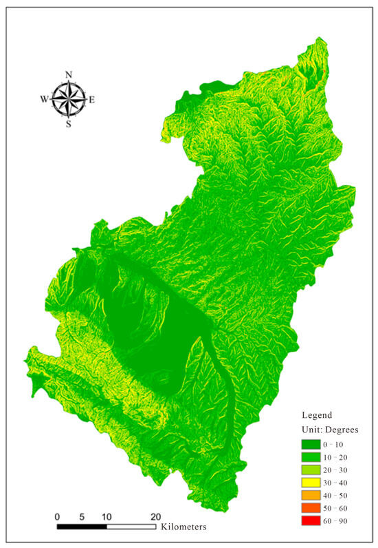 The slope factor of Yuzhong County was extracted using 1∶50,000 DEM data, and it was divided into basic units of 10° (Figure 1). The area of Yuzhong County with a slope less than 10° accounted for 24.23%; between 10° and 20°, 29.59%; between 20° and 30°, 29.03%; between 30° and 40°, 15.09%; between 40° and 50°, 1.93%; between 50° and 60°, 0.12%; and the areas with a slope greater than 60° were very rare, accounting for only 1.01%. It can be seen that the terrain of the study area is mostly small-angle slopes less than 40°, so the disasters generated are inevitably shallow-layer collapse disasters, and it is suitable to use SINMAP infinite slope analysis.
