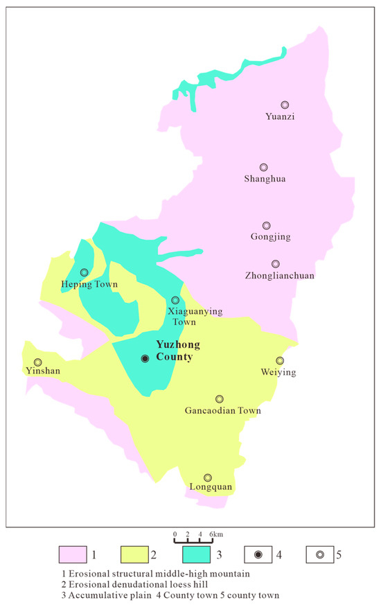 Regarding topography, Yuzhong County is located within the Qilian Mountain orogenic belt, in the Qilian Block. Due to the uplift of the central Qilian Block since the Quaternary period and erosion by water flow, the local terrain has developed into a loess hilly landscape (Figure 2). Based on the formation causes and morphological characteristics of the landscape, its landform can be classified into three types: erosion–construction mid-mountain, erosion–erosion loess hilly area, and accumulation plain. Among them, the erosion–construction mid-mountain is the main distribution area of debris flows and landslides, accounting for 48.1% of the total land area of the study area. The study area is located at the western edge of the Loess Plateau. Due to the intense uplift caused by the new tectonic movement in this region, the terrain is highly dissected. The loess terrain is mainly composed of ridges and mounds. There are significant differences in the terrain between the north and the south. The north is a low mountainous area covered with metamorphic rocks and granite, the middle is an eroded and eroded loess hilly area and a high terrace hilly area covered by Malan loess, and the south is a high terrace area buried by loess in the mountains.