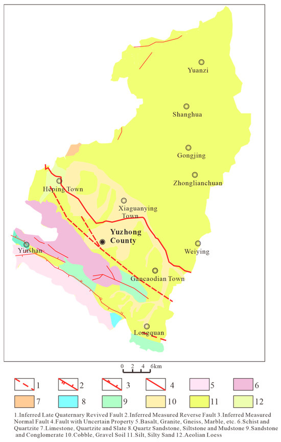 Stratigraphically, the area belongs to the Huangyuan–Lanzhou subregion, which is situated in the eastern segment of the Qilian Mountains division within the Qilian Mountain stratigraphic region of the North China Plate [42]. The study area is mostly covered by the Quaternary Period loose strata. The underlying strata include the Lower Archean Maixian Mountain Group, Middle Archean Galgan Group, Xinglong Mountain Group, Huashishan Group, Mesozoic Jurassic, Upper Cretaceous, and Neogene Paleogene and Quaternary strata. Among them, the lithology of the pre-quaternary strata includes basalt, granite, black mica schist, gneiss, dolomite, marble, amphibolite, conglomerate, boulder conglomerate, sandstone, and sandy mudstone. The Quaternary strata are mainly composed of red-yellow sandy loess-like sub-sandy soil and wind-blown Malan loess (Figure 3).