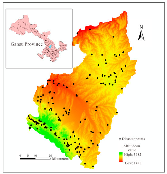 According to the geological hazard risk survey report of Yuzhong County, Lanzhou City, Gansu Province (1:5000), the lengths, widths, heights and volumes of the landslide bodies, as well as the scale and current stability of the landslide disaster points in Yuzhong County, were statistically analyzed. The latest data show that there are 176 potential landslide disaster points in Yuzhong County (Supplementary Materials). Among them, 95% are soil slopes, 95% are shallow landslides with a slope thickness of less than 10 m, and 95% are small-scale. It can be seen that the slope deformation in the study area is mainly small-scale deformation. Based on the DEM elevation data of the study area, Figure 4 shows a map of landslide disaster points and the terrain elevation of the study area.