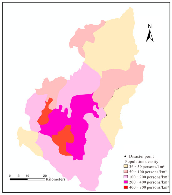 To further assess the impact of landslides on local populations, the concept of Personnel Risk Level (PRL) is introduced () [43]. Based on the geological disaster risk investigation report of Yuzhong County, Lanzhou City, Gansu Province (1:50,000), the population density of Yuzhong County is shown in Figure 6.