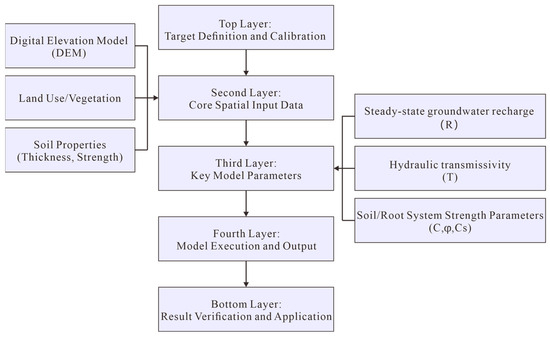 SINMAP is essentially a spatial analysis model based on GIS, rather than a traditional “physical model”. It combines the spatial data processing capabilities of GIS with a simplified physical model to assess the shallow stability of slopes regionally. The specific modeling process is shown in Figure 7.