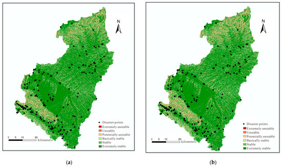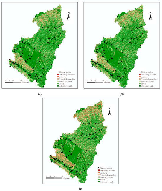 Figure 8 indicates that with rainfall intensity increases, the extent of stable areas decreases, while unstable areas expand. Unstable zones are predominantly located in regions characterized by higher elevations, steeper slopes, and more developed drainage networks.