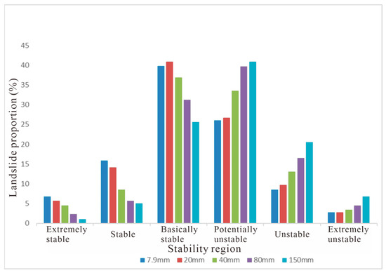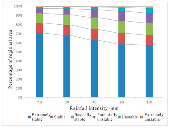 Quantifying the area of unstable zones offers a clearer representation of the effects of varying rainfall intensity. Changes in area and corresponding proportions are presented in Table 4 and Figure 9.