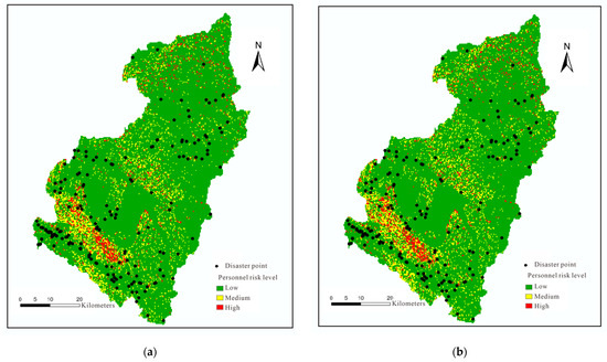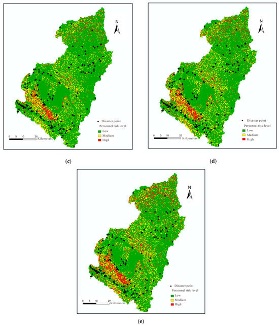 Figure 11 indicates that high-Personnel-Risk-Level-areas are mainly concentrated in the southern part of Chengguan Town, the southwestern part of Lianda Township, and the central and southern parts of Dingyuan Town. Medium-Personnel-Risk-Risk-Level areas are primarily distributed throughout Mapo Township; the southwestern part of Xiaokangying Township; the northern part of Qingshuiyi Township; the northwestern and southern parts of Heping Town; the entire Xiaguan Ying Town; the northern parts of Jinya Town, Haxian Township, Shanghuacha Township, and Yuanzicha Township; and the southern part of Qingcheng Town. Chengguan Town, Lianda Township, and Dingyuan Town are all located in densely populated areas where human engineering activities are frequent, particularly road and railway construction and slope cutting for residential development. Such activities compromise the natural stability of slopes and create favorable conditions for the occurrence and expansion of landslides.