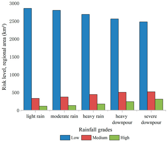Based on the results in Table 7, stability histograms for different rainfall intensities are plotted in Figure 12. It can be clearly seen that the area with a low Personnel Risk Level accounts for a relatively high proportion. As the rainfall level increases, the area with a low Personnel Risk Level decreases, while the areas with medium and high Personnel Risk Levels gradually increase. However, the extent of decrease and increase is relatively small.