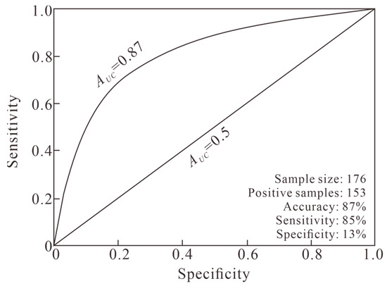 The SINMAP model divides larger areas into unstable or stable regions [46]. Therefore, in order to characterize the slope instability under different rainfall intensities, the potential unstable, unstable, and extremely unstable areas were selected for area analysis. The accuracy of the landslide sensitivity model was determined using the ROC curve. The ROC curve is often used to evaluate the accuracy of diagnostic tests. The area under the ROC curve (AUC) ranges from 0.5 to 1. A value of AUC closer to 1 indicates a more accurate model, while a value close to 0.5 indicates a less accurate model. The ROC curve of the SINMAP model is obtained as 0.87, as shown in Figure 13, indicating the accuracy of the model.