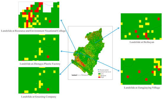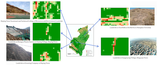 To further confirm the rationality of the stability classifications and Personnel Risk Levels, five representative landslides within the study area were selected for validation. These include the landslide near the Vocational College of Resources and Environment in Heping Town; the Zhongyu Plastic Factory landslide in Taiping Village, Heping Town; the Greening Company landslide in Heping Town; the Xiaodakou Heihucha landslide in Shanghua Township; and the Jiangjiaying Village landslide in Dingyuan Town. The locations of these landslide disaster points were compared with the previously generated distribution maps. As shown in Figure 14 and Figure 15, the comparison results demonstrate that the evaluation is reliable.