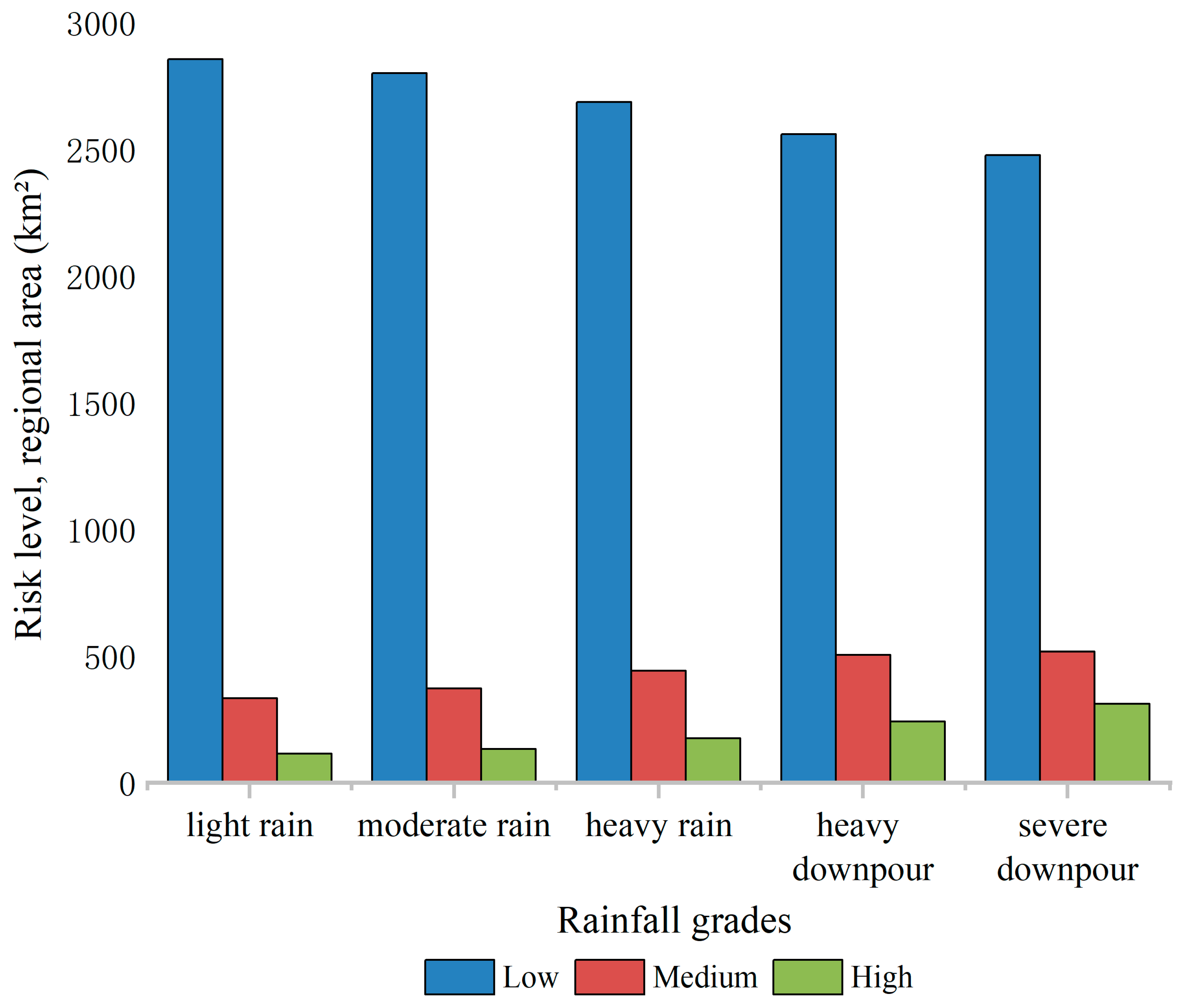 | Area/km2 Rainfall Category Risk Level | Light Rain | Moderate Rain | Heavy Rain | Rainstorm | Severe Rainstorm |