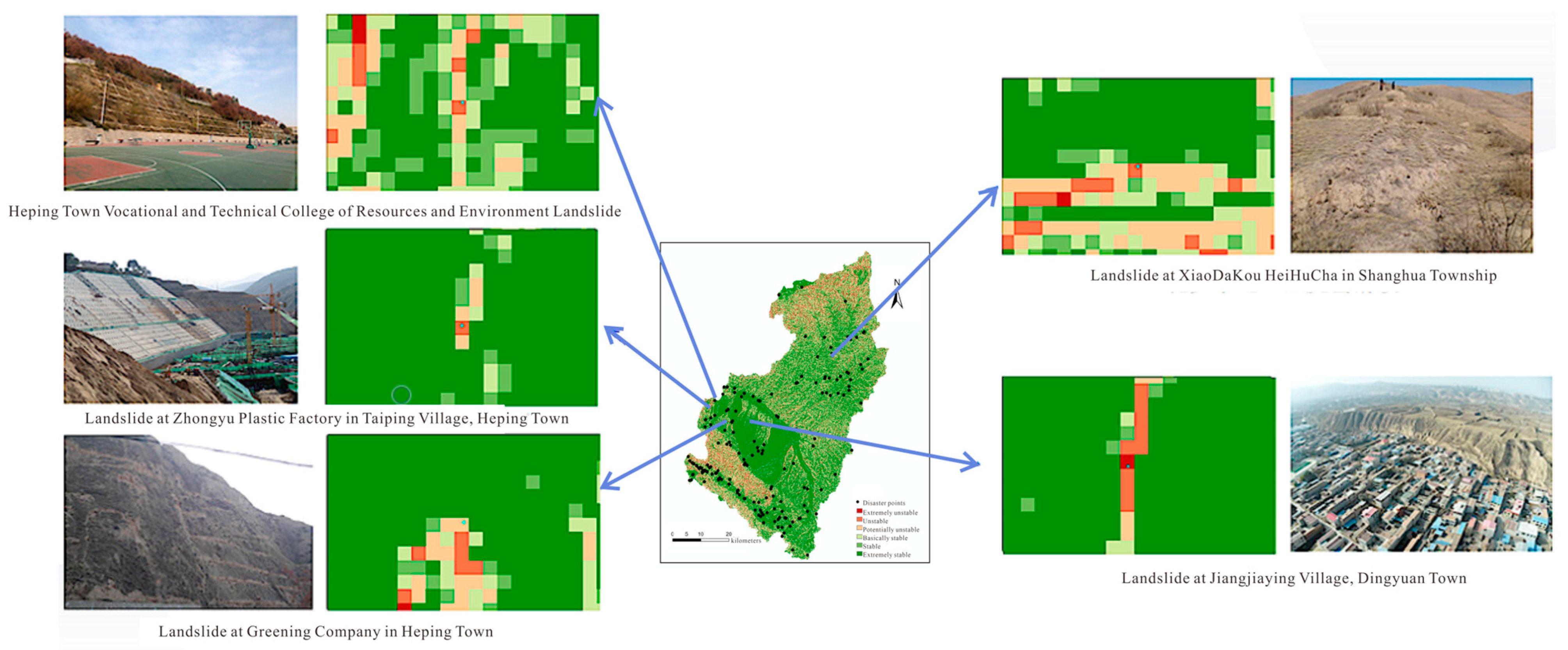 - Li, W.; Liu, C.; Scaioni, M.; Sun, W.; Chen, Y.; Yao, D.; Chen, S.; Hong, Y.; Zhang, K.; Cheng, G. Spatio-Temporal Analysis and Simulation on Shallow Rainfall-Induced Landslides in China Using Landslide Susceptibility Dynamics and Rainfall I-D Thresholds. Sci. China Earth Sci. 2017, 60, 720–732. [Google Scholar] [CrossRef]