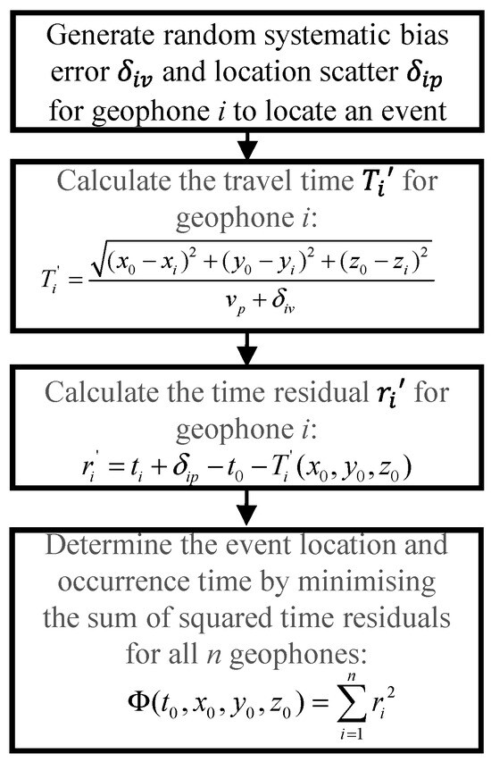 According to Equations (1)–(3), a source-locating result considering random location scatters and systematic bias can be derived. Figure 1 shows a flow chart showing the process of locating a seismic event with errors of location scatter and systematic bias.