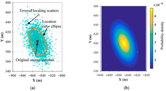 If we continuously mislocate the source by providing a random and , an elliptical distribution of source-locating results will be presented, representing the so-called emulation tests. The size and orientation of the ellipse can demonstrate the magnitude and vector characteristics of the source location error, which is shown in Figure 2. The average location error can also be calculated using the emulation testing results: