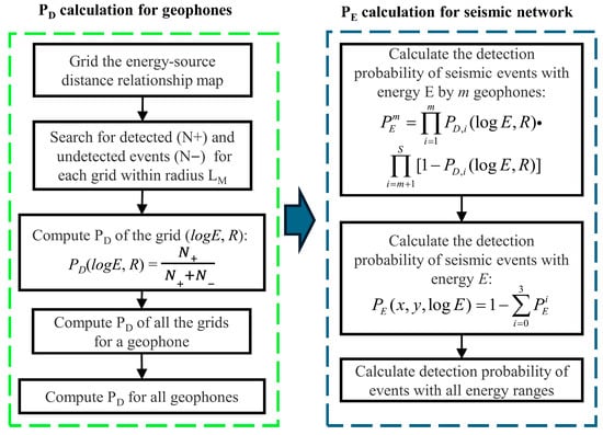 For the target mining area, the detection probability distribution of the seismic network to different energy levels can be derived by dividing the area of interest into grids and calculating for each grid using Equation (8). Figure 3 shows a flow chart for the and calculations.