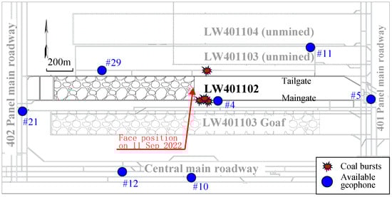 LW401102 layout, distribution of available geophones, and coal burst damage locations.