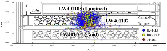 The mine is equipped with the Polish SOS seismic monitoring system for the real-time observation of damage and stress conditions of the coal and rock mass. The seismic network has 32 single-component geophones deployed in the mine. Geophones have a response frequency range of 1–600 Hz, a sampling rate of 500 Hz, and a maximum data transmission rate of 1 MB/s. During the LW401102 retreat period, four near-field geophones were installed in the longwall roadways ahead of the face and moved as the longwall advanced, and other far-field geophones were fixed in the surrounding area.