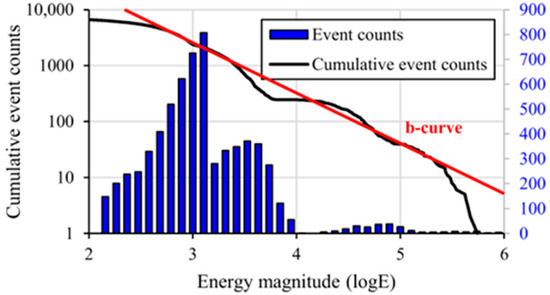 In this study, a total of 6633 monitored seismic events from 1 August to 11 September 2022 in LW401102 were analysed. The distribution of seismic events with different energy magnitudes is shown in Figure 5. Strong seismic events with energies over 10 k were mainly located around the intersection between the longwall face and the two roadways. Seven available geophones were used for seismic monitoring in LW401102 during this period; their layout is shown in Figure 4. Since near-field geophones frequently experience signal interference due to intense mining-induced noise, only Geophone #4, in the maingate ahead of the longwall face, was used as a near-field geophone. The other six geophones, placed more than 600 m from the longwall face, served as far-field geophones. The near-field geophone was used to detect medium–low-energy events, and far-field geophones were used to capture medium–high-energy events. This configuration made it particularly difficult to accurately detect seismic activity in LW401102 during the study period. Figure 6 illustrates both the cumulative event count curve and the energy-level distribution histogram. The distribution deviates from the Gutenberg–Richter power-law function, indicating a notable absence of medium-to-high-energy events in the catalogue.
