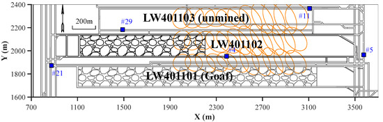 The proposed two methods were demonstrated at Mengcun Coal Mine, in the central–western region of the Binchang Mining Area, Shaanxi Province, China, where the mined coal seam is nearly horizontal, with an average thickness of 16.25 m. The target longwall, LW401102, is the second longwall in 401 Panel, where the fully mechanised top-coal caving mining method was used. The longwall is 180 m wide and 1790 m long, and its average mining depth is 700 m. As shown in Figure 4, to the north of LW401102 is a 40 m coal pillar and the tailgate of LW401103, while to the south is a 75 m coal pillar and the LW402101 goaf. The east and west sides are bordered by the main roadways of the 401 Panel.
