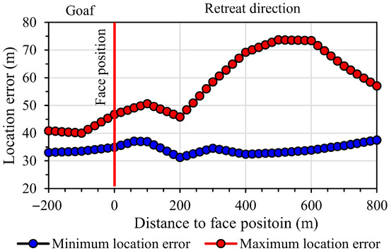 Figure 8 illustrates the extreme value range of positioning error variation for the seismic network at different distances ahead of the LW401102 face. It can be seen that the network achieves optimal source-locating accuracy within 200 m behind the goaf area, with errors ranging between 28 and 41 m. Within the 200 m zone ahead of the face, location errors exhibit an initial rise followed by a decline, reaching a minimum of 30 m and a maximum of 50 m. Beyond this 200 m range, the minimum error stabilises at 30–35 m while the maximum error significantly increases to over 70 m. Integrating the results displayed in Figure 7 suggests that such a location discrepancy may stem from insufficient network coverage in the northwest–southeast direction.