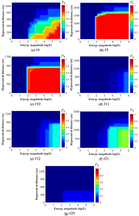 Compared to geophones #4, #5, and #10, geophones #12 and #21, located in the main roadway of the panel, exhibit a significant reduction in wave detection capacity. Geophone #21 has a specific detection capacity for seismic events with logE 3.5–6 occurring within 1100 m, with a width of about 0.4–0.5. Still, it has almost no capacity to detect events with logE ≤ 3.5 (see Figure 9f). Geophone #12 only has the specific capacity to detect seismic events with logE 5–6 occurring within about 900 m, with a width of approximately 0.4 (see Figure 9e). For events with magnitudes of logE 3–4, the of geophone #12 quickly drops to only 0.1–0.3, and it is almost unable to detect events with logE ≤ 3. Geophones #11 and #29, located on the north side of LW401102, also present weak wave detection capacities. The of geophones #11 is only 0.1–0.2 for events with logE 5–6 occurring within 1000 m (see Figure 9d), while the of geophones #29 is only about 0.1 for events with logE = 2–6 occurring within 400 m (see Figure 9g). These results indicate that the distribution of detection probabilities can reflect the comprehensive influence of factors such as source energy, distance, mining-induced noise, propagation path, and even installation method on the geophones. This provides a quantitative description of the wave detection capacity characteristics of geophones at different locations in the mining field.